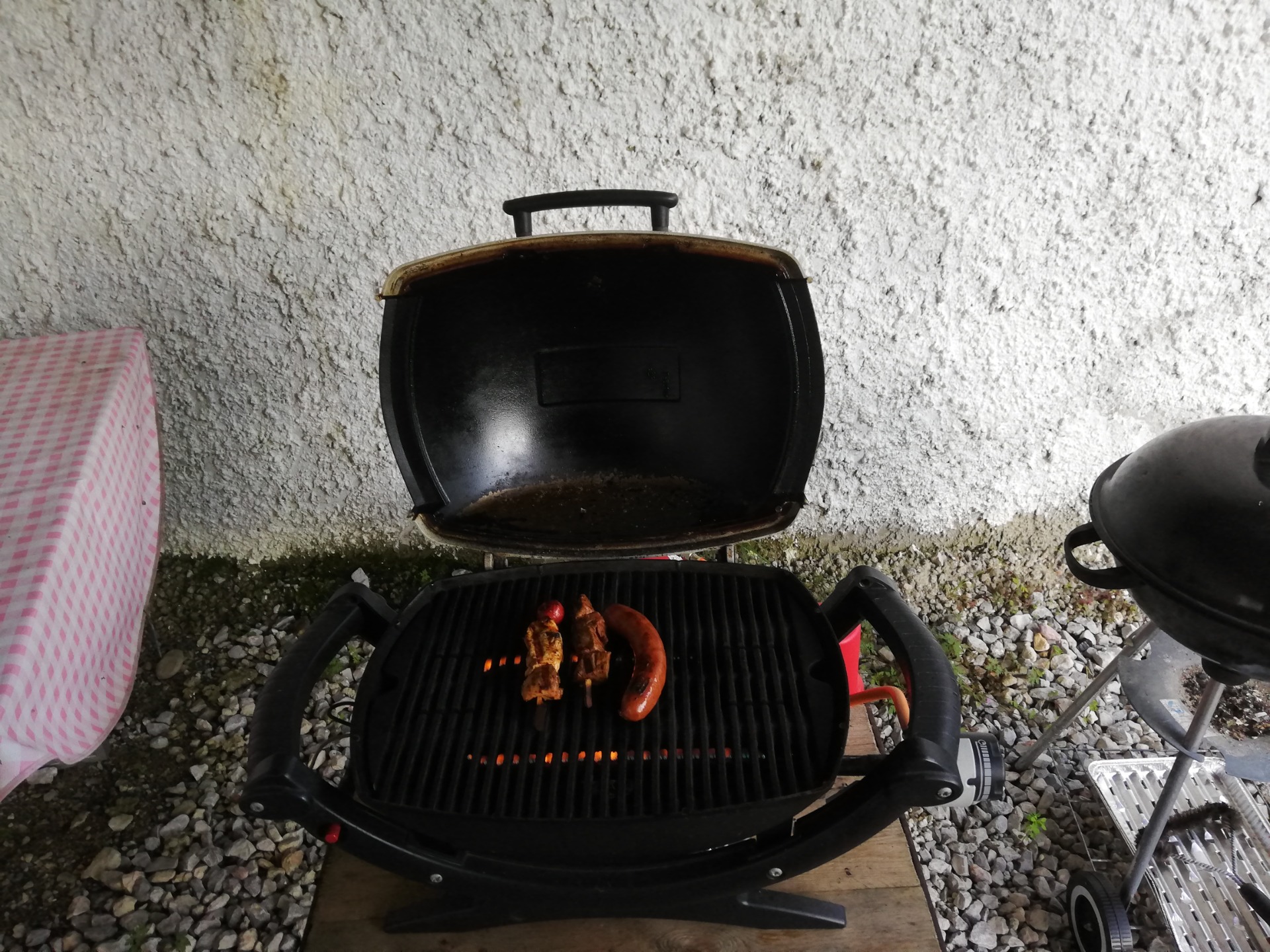 Vor dem Haus stehen ein Weber Gasgriller mit Gasflasche und ein Holzkohlegrill.